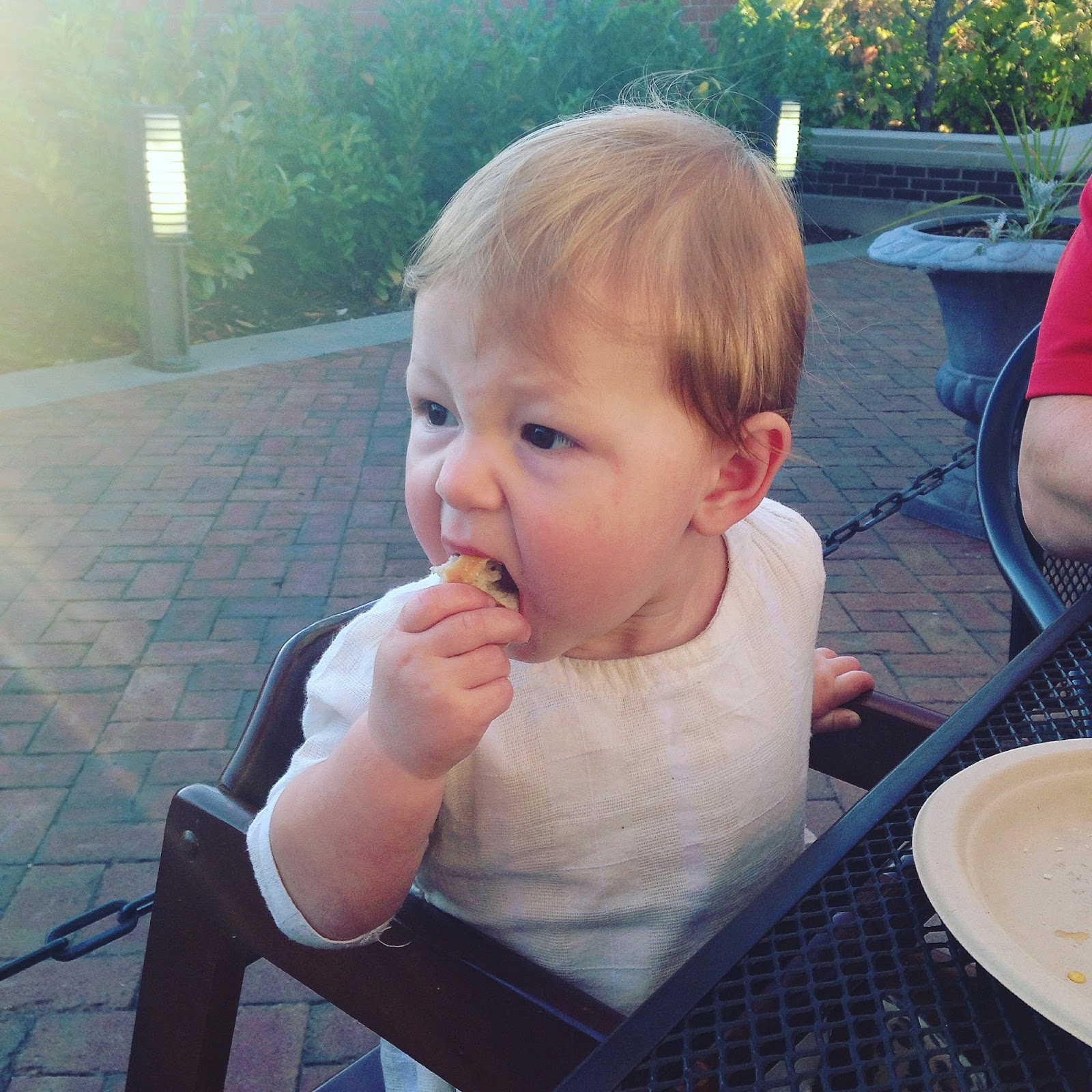 Everly loooves bread. She was killing some garlic bread knots, trying so hard to shove the whole thing in her mouth at once.